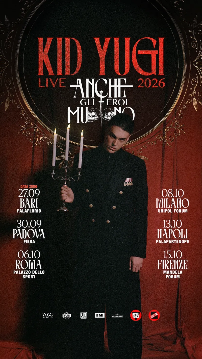 Kid Yugi sta per conquistare per la prima volta i palchi dei principali palasport italiani con il suo "Anche Gli Eroi Muoiono Tour 2026”. Dopo il successo del nuovo album, il cantante è pronto ad abbracciare tutti i fan dal vivo, con epici show autunnali in sei città italiane. La data zero sarà ovviamente in Puglia, la terra natale dell’artista.