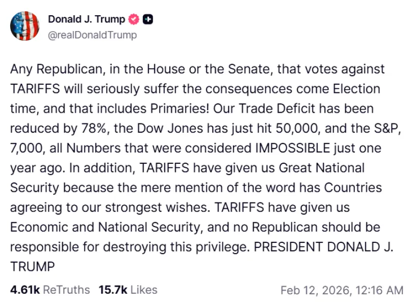 "Il nostro deficit commerciale è stato ridotto del 78%, il Dow Jones ha appena raggiunto quota 50.000 e l'S&P 7.000, tutti numeri che solo un anno fa erano considerati IMPOSSIBILI. Inoltre, i DAZI ci hanno garantito una grande sicurezza nazionale, perché la sola menzione della parola fa sì che i Paesi accettino i nostri più fervidi desideri. I DAZI ci hanno garantito sicurezza economica e nazionale, e nessun repubblicano dovrebbe essere ritenuto responsabile della distruzione di questo privilegio", ha affermato Trump.
