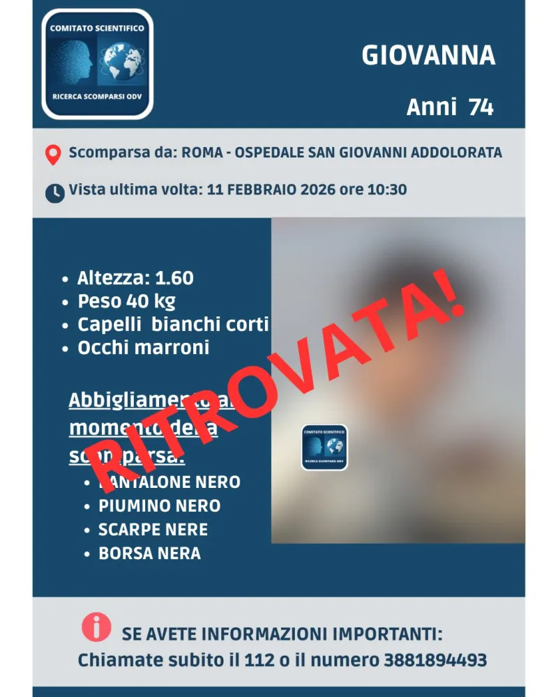 Si è conclusa con un esito positivo la vicenda legata alla scomparsa di Giovanna Corcione, avvenuta a Roma l'11 febbraio 2026.