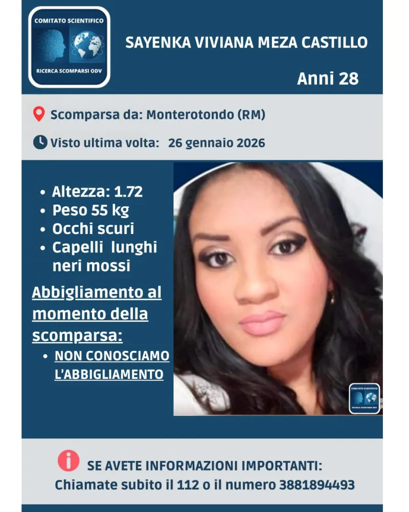 Proseguono le ricerche di Sayenka Viviana Meza Castillo, 28 anni, di origini ecuadoriane ma residente in Italia, scomparsa da Monterotondo, in provincia di Roma, dopo il 7 gennaio 2026.