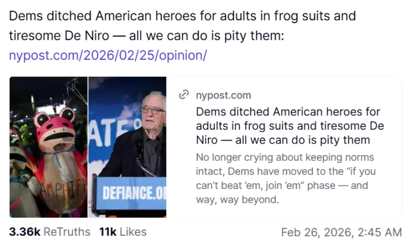 "I democratici hanno abbandonato gli eroi americani in favore di adulti in costume da rana e del noioso De Niro. Tutto ciò che possiamo fare è compatirli", ha affermato Donald Trump in un post su Truth Social.