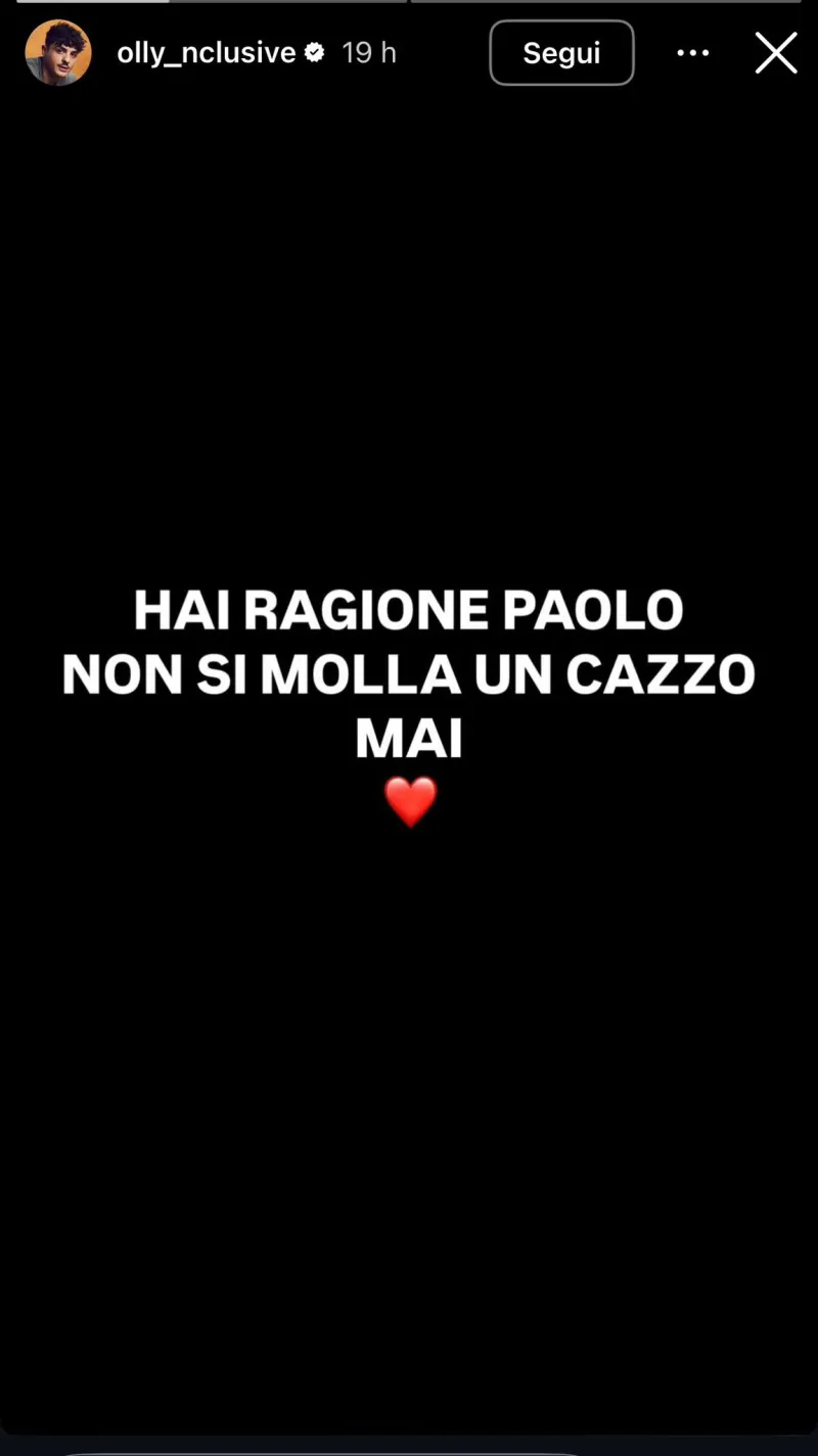 Da una storia Instagram è poi arrivata anche la risposta di Olly: "Hai ragione Paolo, non si molla un ca**o mai".