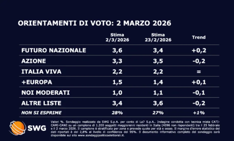 Queste le principali novità dell'ultimo sondaggio realizzato da SWG per il TgLa7 aggiornato al 2 marzo 2026 sulle intenzioni di voto degli italiani per le politiche del 2027.