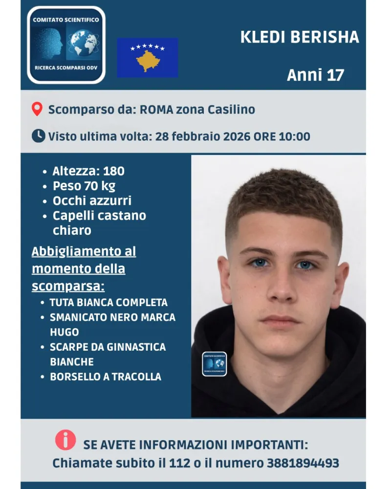 Scatta l’allarme per Kledi Berisha, il ragazzo di 17 anni di cui si sono perse le tracce a Roma nella zona Casilino nella mattinata del 28 febbraio 2026.