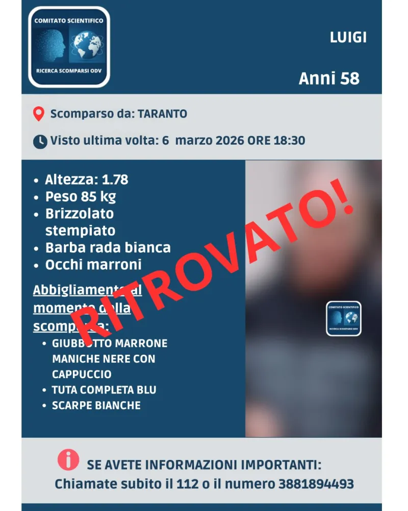Si è conclusa con esito positivo la vicenda della scomparsa di Luigi, l’uomo di 58 anni di cui si erano perse le tracce a Taranto nel pomeriggio del 6 marzo 2026.