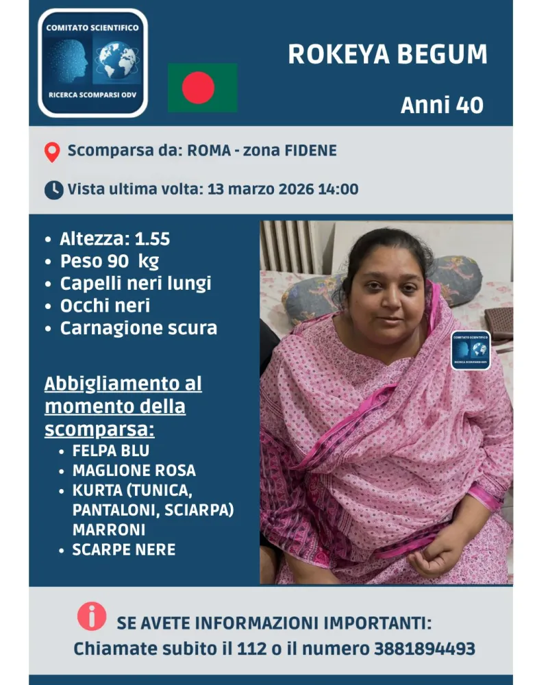 Cresce la preoccupazione per Rokeya Begum, la donna di 40 anni di cui si sono perse le tracce a Roma, nella zona Fidene, nel primo pomeriggio del 13 marzo 2026.