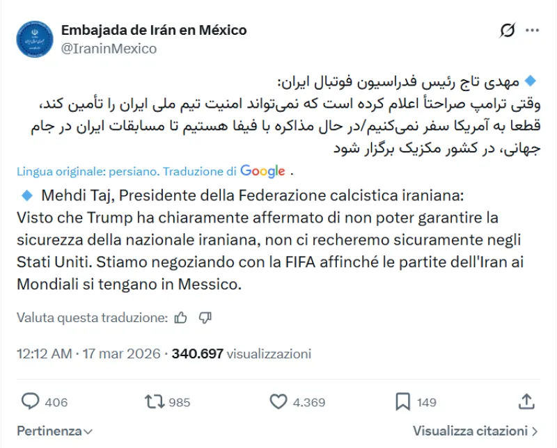 L’ambasciata iraniana in Messico ha confermato che sono già in corso negoziazioni con la FIFA per spostare le partite del primo turno del torneo mondiale in Messico, uno dei paesi ospitanti del Mondiale 2026.