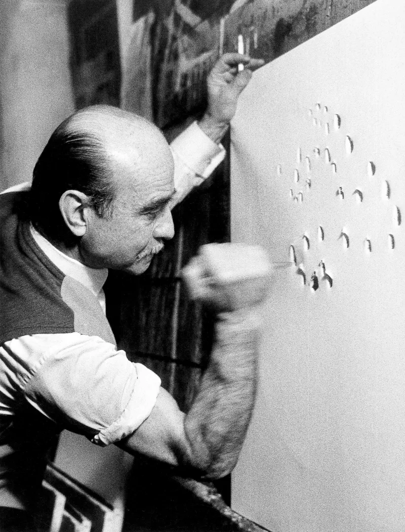 La personalità eclettica e innovativa di Fontana spaziava dalla scultura alle ceramiche, agli ambienti teatrali e agli interventi architettonici, il tutto sempre guidato da un’idea ben precisa: considerare l’arte come elemento cosmico, oltre la materia.