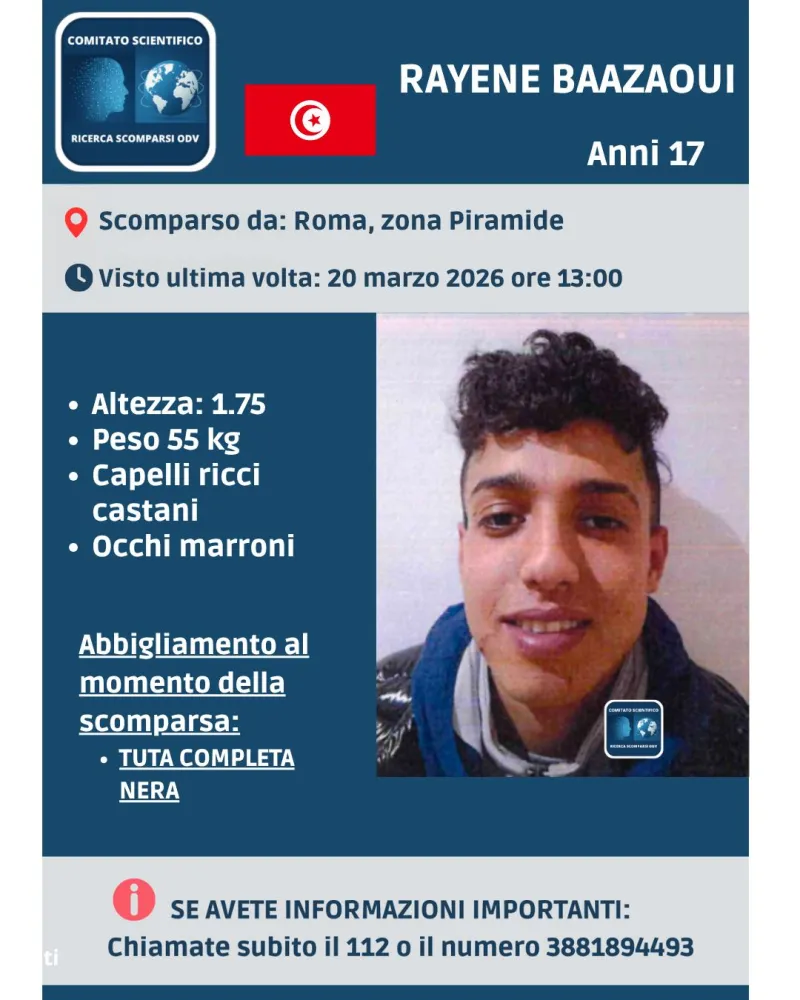 «Possiamo confermare che Rayene si è allontanato da un centro di accoglienza situato nella zona Piramide a Roma intorno alle ore 13:00 del 20 marzo», spiegano dal Comitato Scientifico Ricerca Scomparsi OdV.