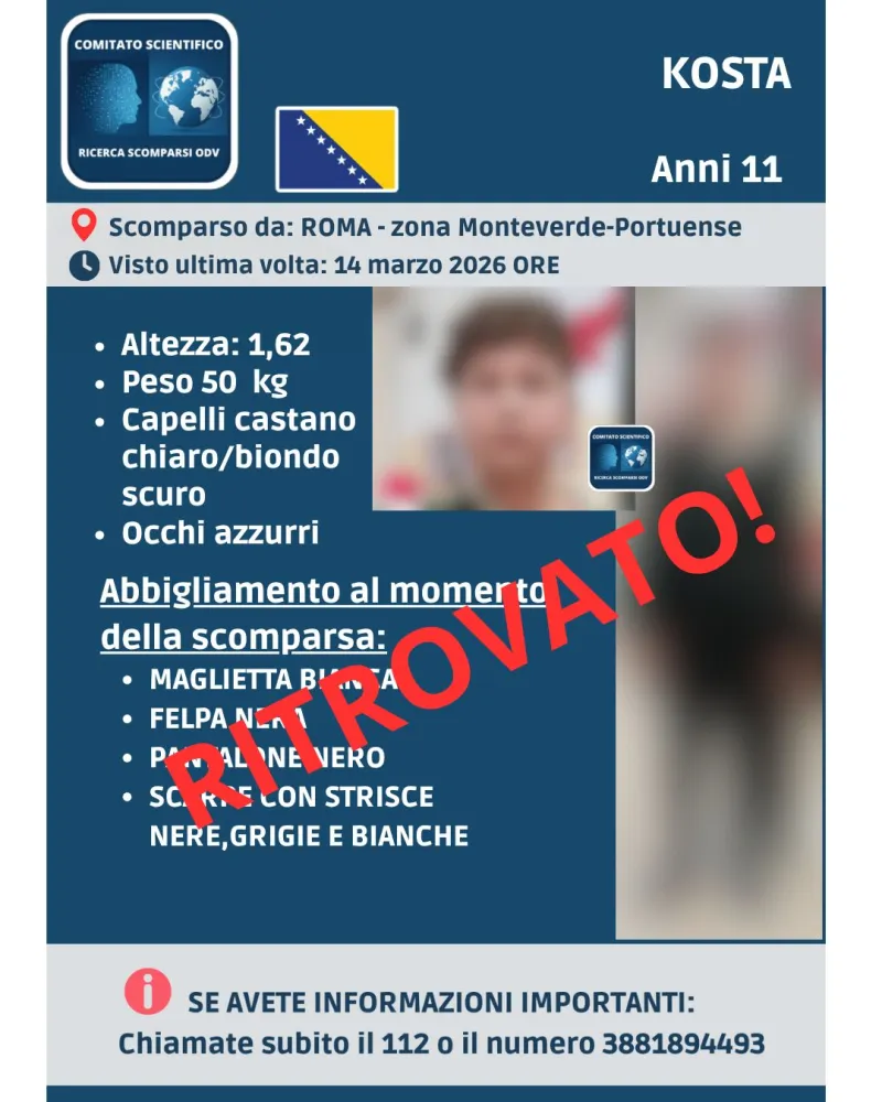 Sono ore di sollievo per gli operatori e i volontari impegnati nelle ricerche di Kosta Hamidovic, l’11enne scomparso nei mesi scorsi da una struttura per minori non accompagnati nella zona Monteverde-Portuense, a Roma.