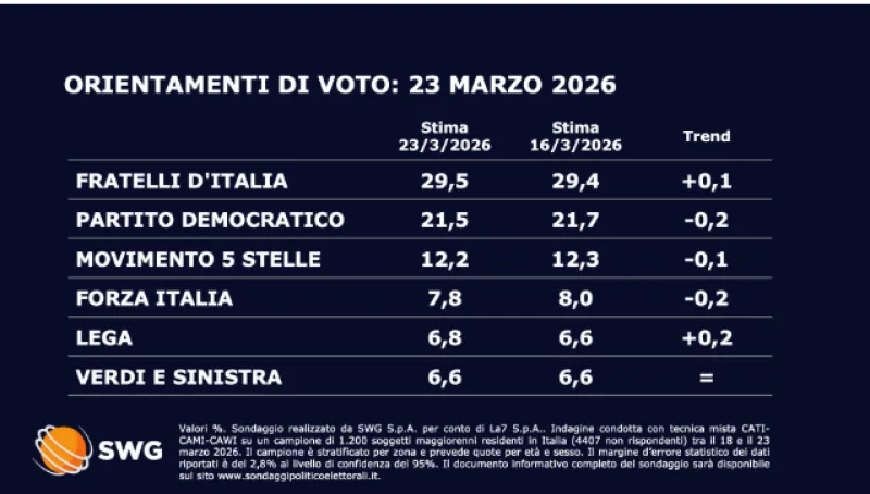 Fratelli d'Italia e Lega in timida ripresa. Giù Pd, M5s e AVS. E' quanto emerge dall'ultimo sondaggio politico realizzato da SWG per il TgLa7 e diffuso lunedì 23 marzo.