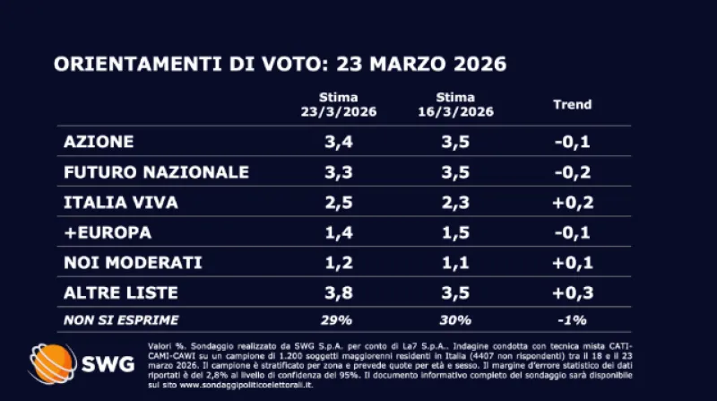 Tra le forze minori, Azione (3,4%) e Più Europa (1,4%) perdono entrambe lo 0,1%, mentre Italia Viva segna una crescita dello 0,2%, risultando tra i pochi partiti dell’area progressista a guadagnare terreno, raggiungendo il 2,5%.
