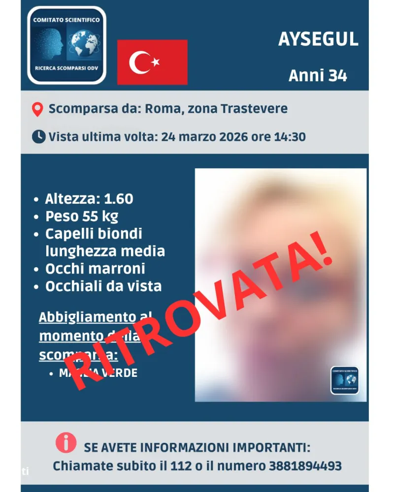 Sono ore di sollievo dopo il ritrovamento di Aysegul, la donna di 34 anni scomparsa da Roma, in zona Trastevere, nella giornata del 24 marzo 2026.