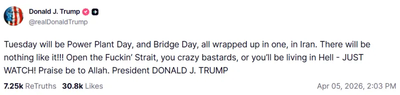Il presidente americano ha minacciato di bombardare le centrali elettriche e i ponti iraniani se il regime non riaprirà lo Stretto di Hormuz, indicando martedì 7 aprile 2026 come una giornata di azione. Trump ha rinnovato la sua minaccia contro l'Iran in un post su Truth Social del 5 aprile con un linguaggio deciso e provocatorio.