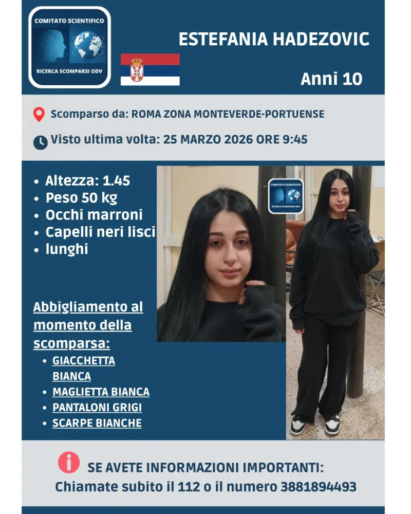 Un possibile avvistamento riaccende l’attenzione sul caso di Estefania Hadezovic, la bambina di 10 anni scomparsa da Roma dopo essersi allontanata da un centro di accoglienza nella zona Monteverde-Portuense il 25 marzo 2026.