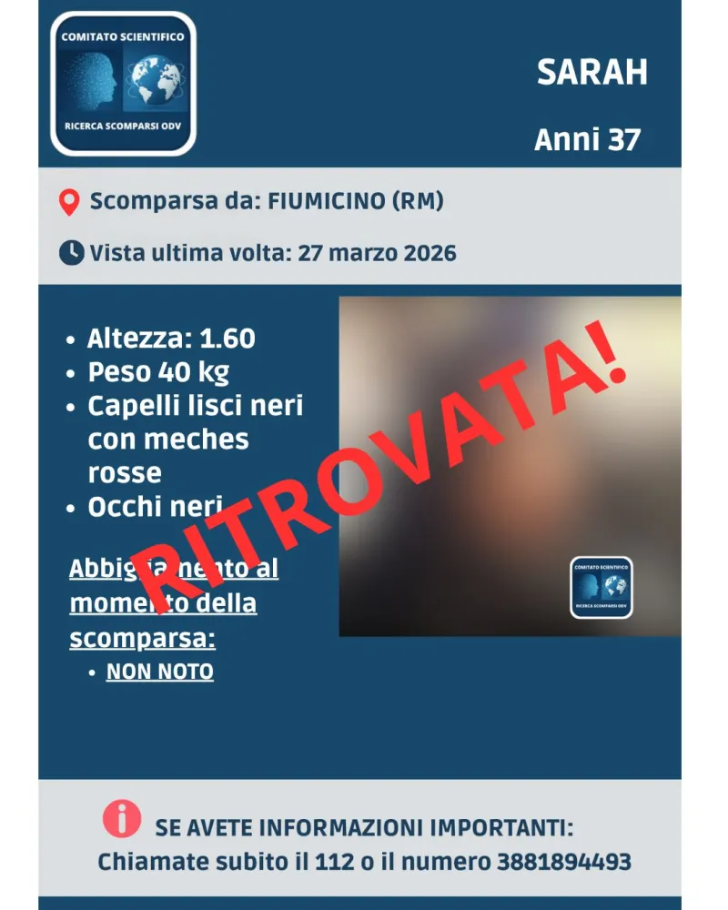 Si chiude con un lieto fine la vicenda di Sarah, la donna di 37 anni di cui si erano perse le tracce dal 27 marzo 2026 e che è stata fortunatamente ritrovata nelle ultime ore.