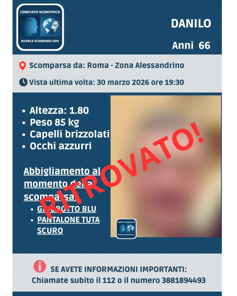 «Possiamo confermare che il signor Danilo è stato ritrovato ed è ricoverato presso l’ospedale Tor Vergata», spiegano dal Comitato Scientifico Ricerca Scomparsi OdV.