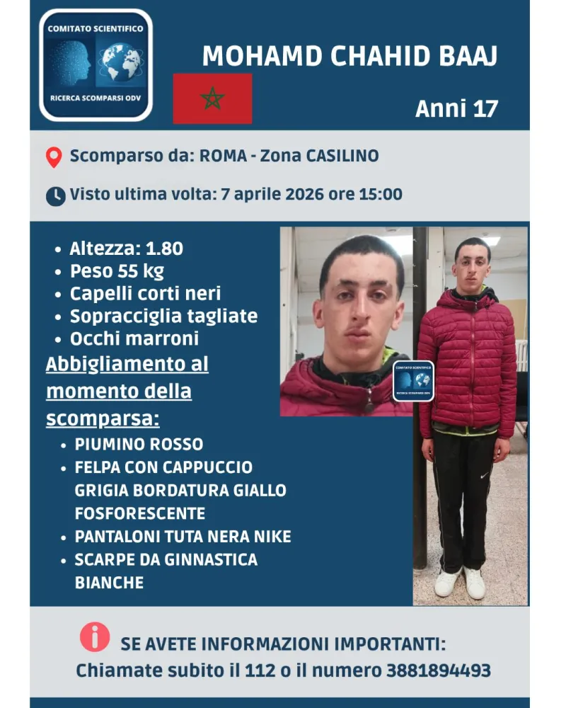 Si sono perse le tracce di Mohamd Chahid Baaj, il ragazzo di 17 anni che si è allontanato da un centro di Roma, in zona Casilino, nel pomeriggio del 7 aprile 2026.
