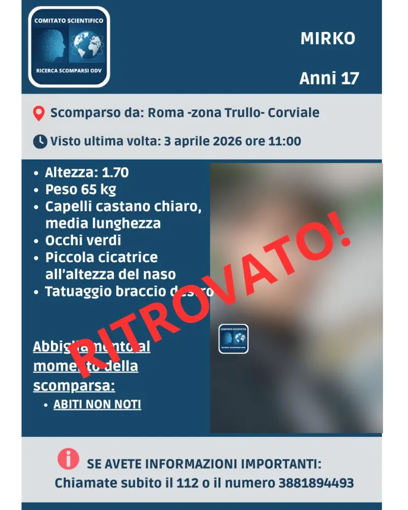 Si è conclusa con un lieto fine la vicenda di Mirko, il 17enne di cui si erano perse le tracce il 3 aprile 2026 dopo l’allontanamento da casa, a Roma, nella zona Trullo-Corviale.
