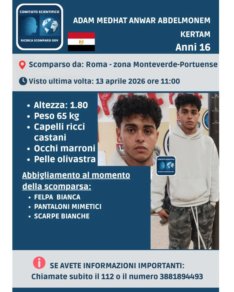 Sono ore di forte attenzione a Roma per la scomparsa di Adam Medhat Anwar Abdelmonem Kertam, il ragazzo di 16 anni che si è allontanato da un centro di accoglienza nella zona Monteverde-Portuense nella giornata del 13 aprile 2026.