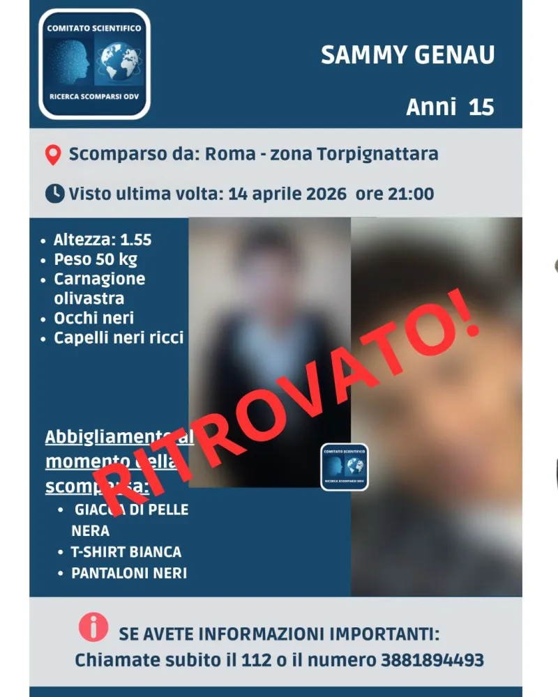 Si è conclusa con un lieto fine la vicenda di Sammy Genau, il ragazzo di 15 anni di cui si erano perse le tracce nella serata del 14 aprile 2026 dopo l’allontanamento da casa, a Roma, nella zona di Torpignattara.