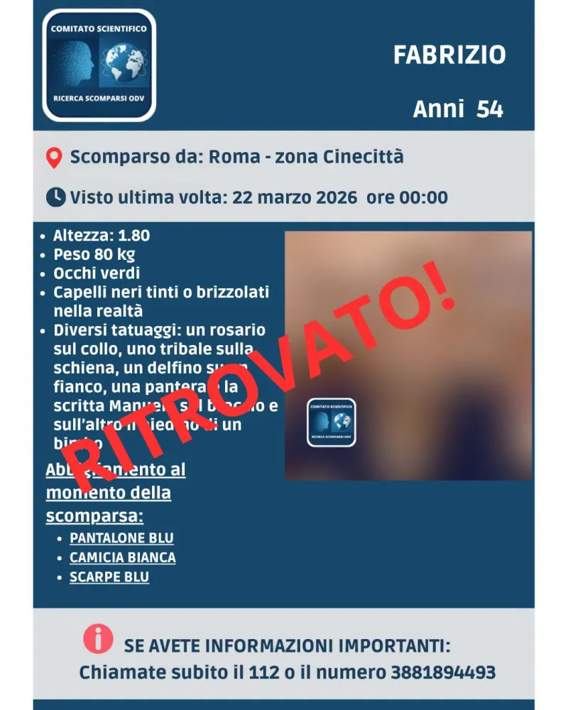 Si è conclusa con un lieto fine la vicenda di Fabrizio, il 54enne di cui si erano perse le tracce nella notte del 22 marzo 2026 dopo l’allontanamento dalla sua abitazione di Roma, in zona Cinecittà.