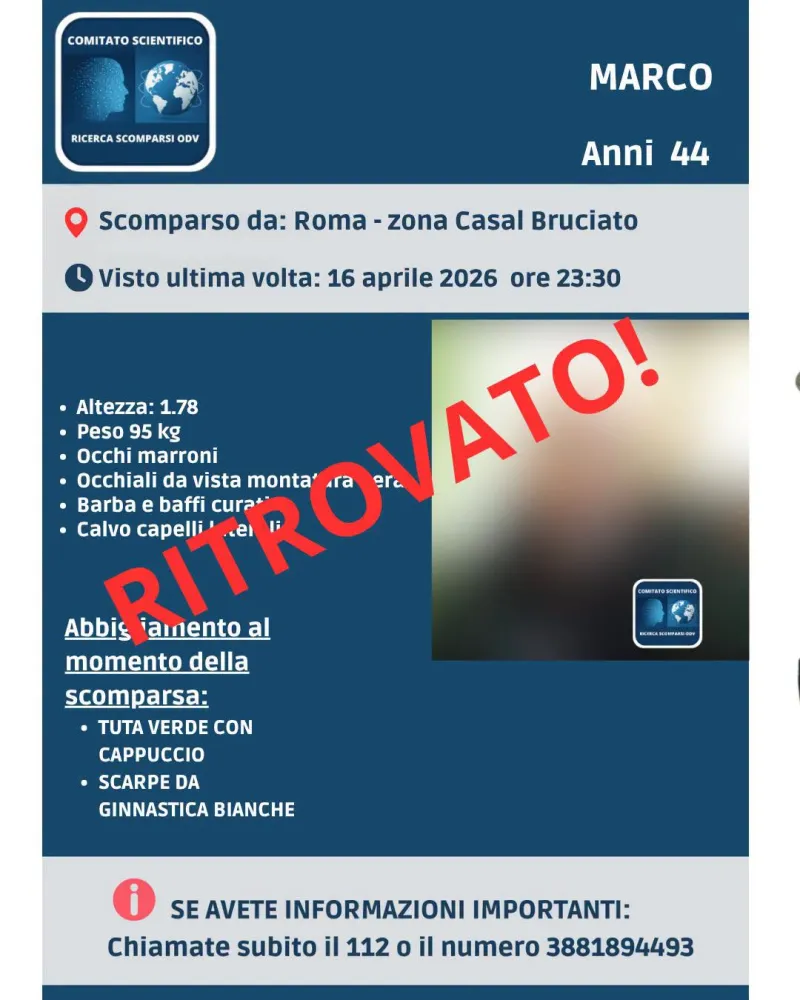 Si è conclusa con un lieto fine la vicenda di Marco, l’uomo di cui si erano perse le tracce dal 15 aprile 2026 dopo l’allontanamento dalla sua abitazione di Roma, in zona Boccea.