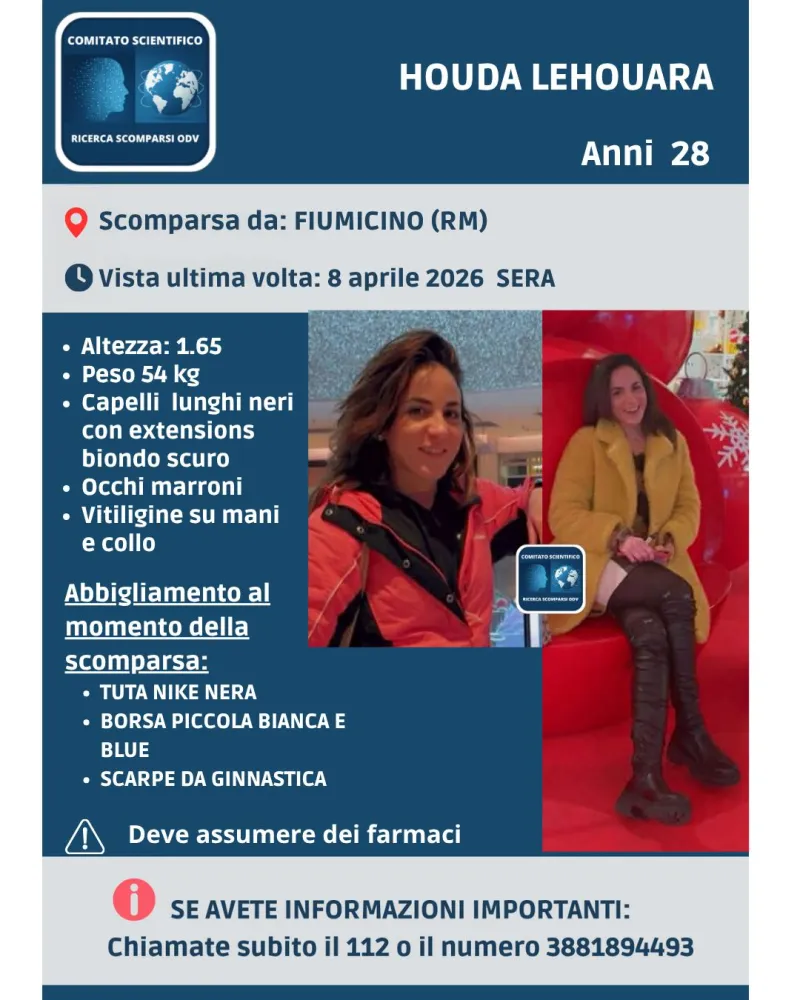 «Chiunque abbia visto Houda o abbia informazioni utili è invitato a contattare immediatamente il 112», spiegano dal Comitato Scientifico Ricerca Scomparsi OdV.