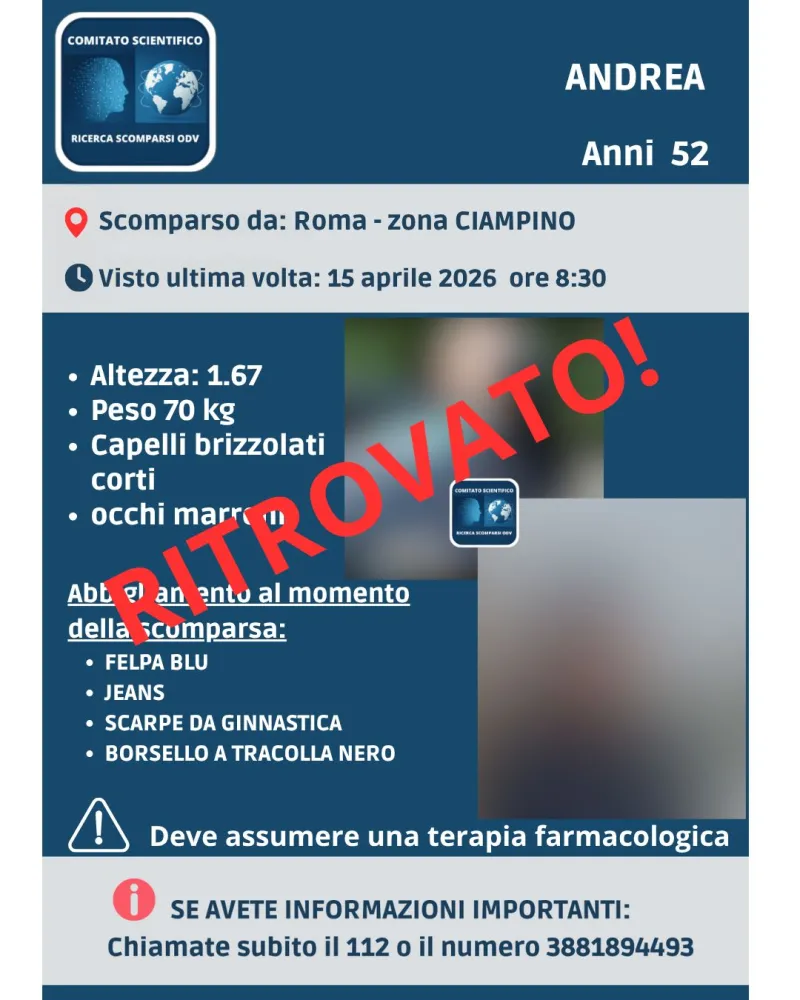 Si è conclusa con un lieto fine la vicenda di Andrea, l’uomo di 52 anni di cui si erano perse le tracce il 15 aprile 2026 dopo l’allontanamento da Roma, nella zona di Ciampino.