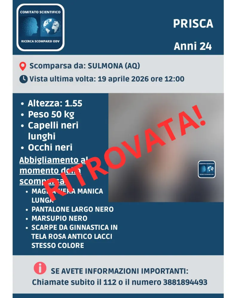Si è conclusa con un lieto fine la vicenda di Prisca, la giovane di 24 anni di cui si erano perse le tracce il 19 aprile 2026 dopo l’allontanamento da casa, a Sulmona, in provincia dell’Aquila.
