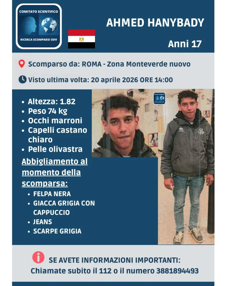 Sono ore di forte attenzione a Roma per la scomparsa di Ahmed Hanybady, il ragazzo di 17 anni di cui si sono perse le tracce nella giornata del 20 aprile 2026 dopo l’allontanamento da un centro di accoglienza della Capitale, in zona Monteverde Nuovo.
