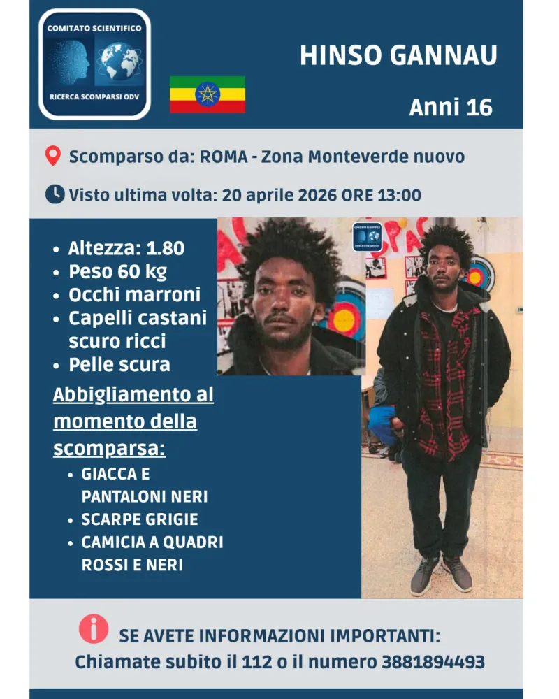 Sono ore di forte attenzione a Roma per la scomparsa di Hinso Gannau, il ragazzo di 16 anni di cui si sono perse le tracce nella giornata del 20 aprile 2026 dopo l’allontanamento da un centro di accoglienza della Capitale, in zona Monteverde Nuovo.