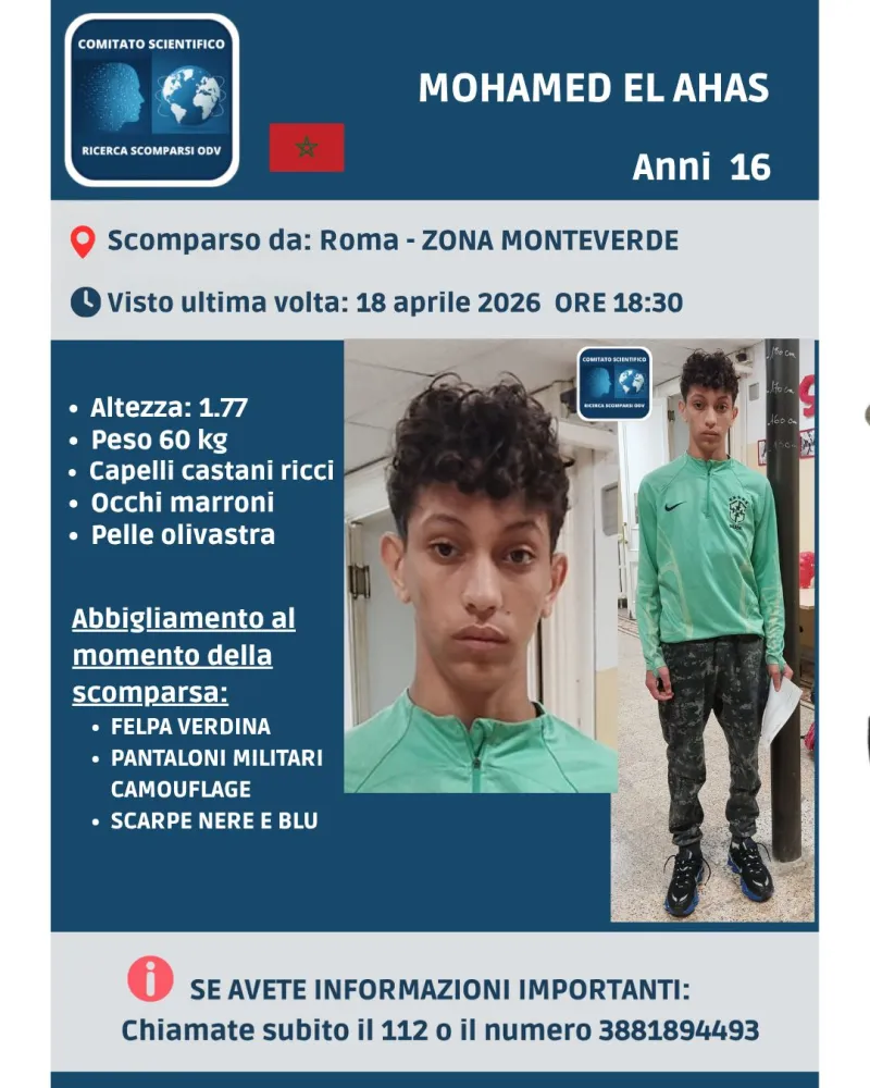 Sono ore di forte attenzione a Roma per la scomparsa di Mohamed El Ahas, il ragazzo di 16 anni di cui si sono perse le tracce nella giornata del 18 aprile 2026 dopo l’allontanamento da un centro di accoglienza della Capitale, in zona Monteverde.
