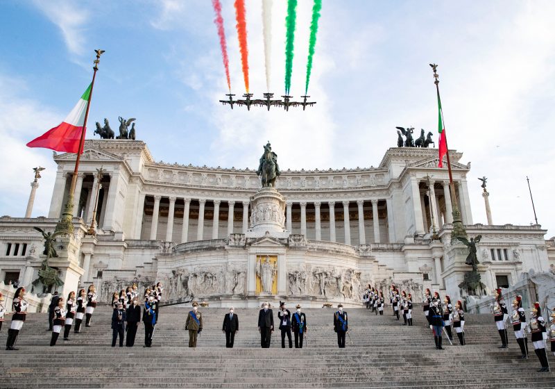 A Piazza Venezia, insieme al presidente del Consiglio Mario Draghi, il Capo dello Stato omaggerà il milite ignoto depositando una corona di fiori. Il tutto mentre il cielo di Roma viene riempito dai colori nazionali grazie alla pattuglia acrobatica delle Frecce Tricolori. Il saluto poi al sindaco di Roma Roberto Gualtieri, che omaggia Mattarella così: "Roma e l'Italia sono con lei".