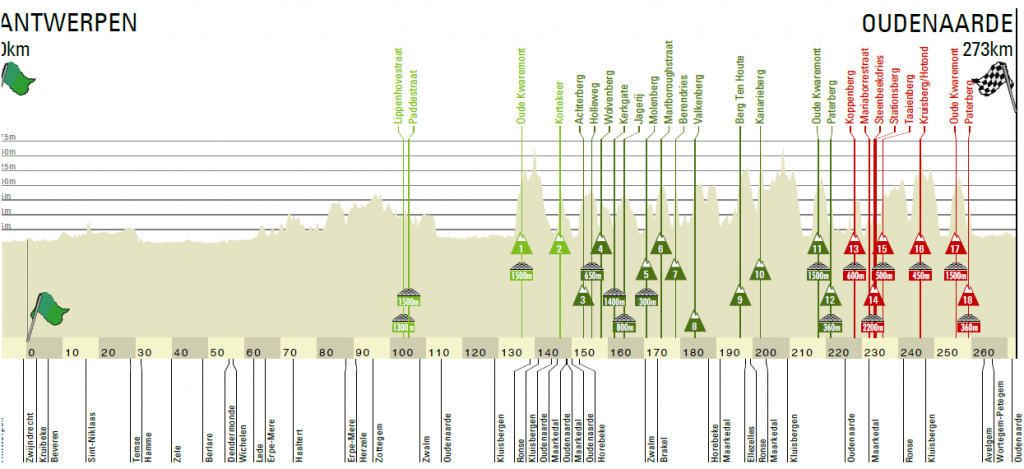 Per quanto riguarda il percorso infatti si partirà di nuovo dal centro di Anversa per la quarta volta consecutiva con il traguardo fissa ad Oudenaarde. Saranno 273km di una gara che si preannuncia faticosa, in un clima spesso ostile per molti ciclisti a causa del freddo e della pioggia.