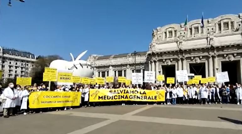 La manifestazione è iniziata con un minuto di raccoglimento in memoria dei camici bianchi che hanno perso la vita durante la pandemia ed è stata promossa delle Coccarde gialle. Un movimento spontaneo non di natura sindacale che ha come obiettivo una riorganizzazione della medicina territoriale.I sanitari sono scesi in piazza per rivendicare una maggiore attenzione sul tema della carenza di medici di base nella regione Lombardia. Un problema attuale e destinato a diventare sempre più imponente nei prossimi anni a causa dei progressivi pensionamenti di buona parte dei dottori oggi in servizio. Secondo i calcoli del movimento, nei prossimi 5 anni il 40% dei cittadini sarà senza medico di fiducia."Stiamo perdendo la sanità pubblica. Lasciateci curare i pazienti senza subissarci di compiti amministrativi è l’accorato appello di una dottoressa che ha partecipato alla protesta. Sulla pagina facebook delle Coccarde gialle è stato diramato inoltre un invito dei medici verso i propri pazienti affinché li affianchino in questa battaglia. Perché il Sistema Sanitario Nazionale è una catena che, per funzionare, abbisogna della robustezza di tutti gli anelli.Leggi anche: Medici di base, secondo giorno di sciopero: Disagi e ambulatori chiusi