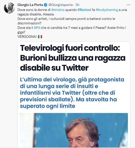 Molte le voci racchiuse in un solo coro: eliminazione del tweet e pretesa plateale di scuse. In tanti invocano anche l'intervento della Rai, con la quale Burioni collabora da due anni, come il giornalista Giorgio La Porta: "Bullizzare e fare body shaming a una ragazza disabile da un profilo con 350mila follower è la nuova politica di inclusione degli ospiti Rai? Voglio Alessia da Fazio e Littizzetto al posto di Burioni. Per molto meno a Orsini è stato tolto il compenso".