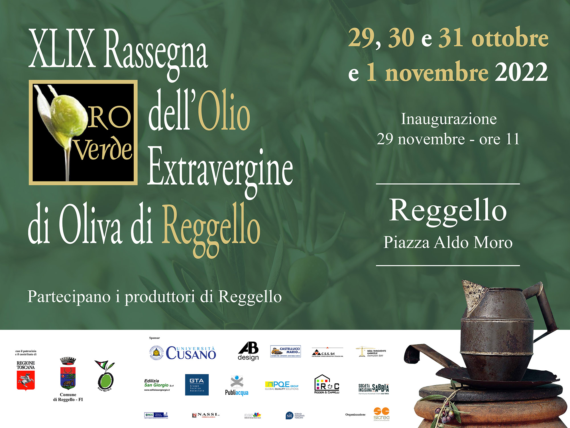 Reggello presenta di nuovo il suo prodotto più prezioso, più amato e conosciuto nel mondo. Tra gli sponsor della manifestazione anche l'Università Niccolò Cusano. Il programma sarà ricchissimo di eventi con cooking-show, degustazioni, le visite nei frantoi e molto altro. Per gli sportivi pronti anche percorsi con e-bike tra gli olivi ai quali potranno partecipare grandi e piccini. Non mancheranno concerti, presentazioni di libri con la presenza degli autori, protagonisti saranno anche i bambini con tante proposte di gioco. Come consuetudine saranno a disposizione gli stand dei produttori che permetteranno di conoscere di persona coloro che realizzano questo straordinario prodotto.
