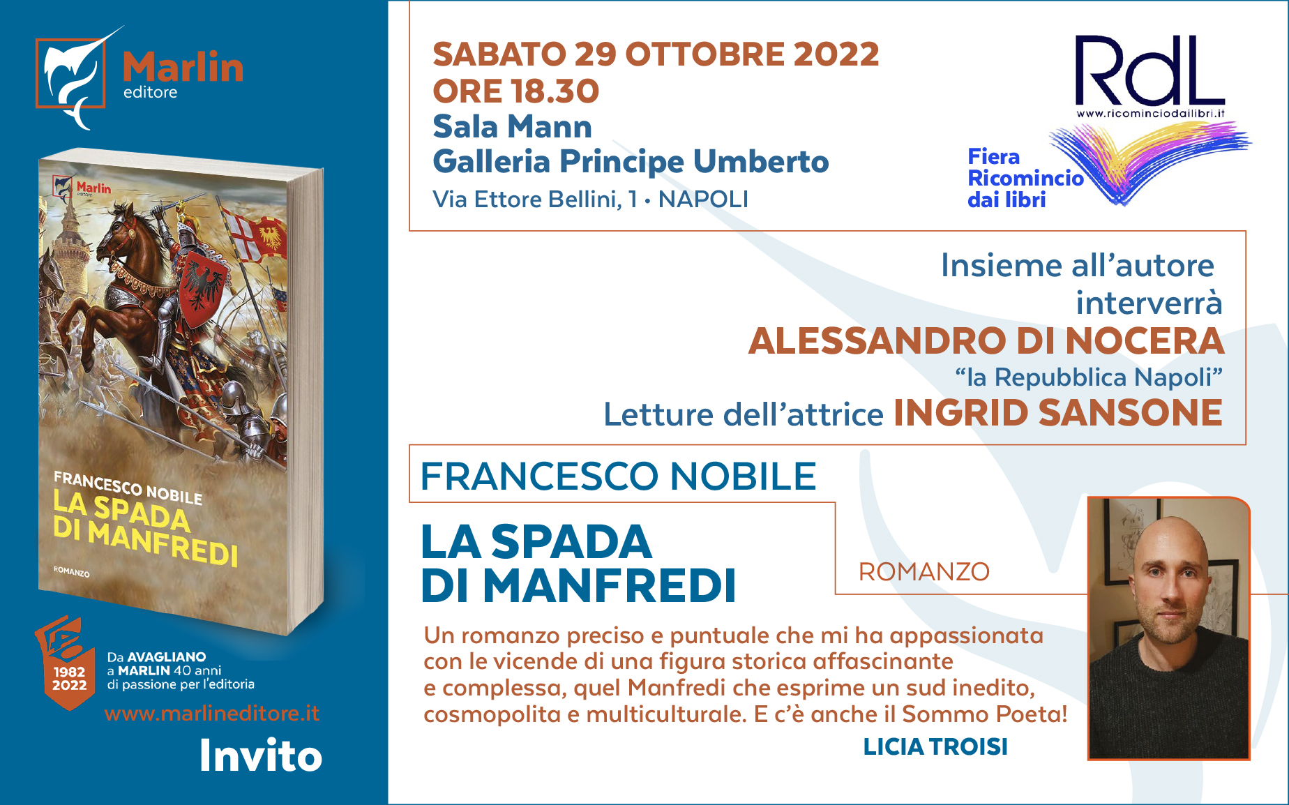 Ricomincio dai Libri torna a Napoli e Marlin Editore è protagonista con uno dei nuovi romanzi del suo catalogo. Sarà presentato presso la Sala Mann il 29 ottobre alle ore 18:30 il romanzo storico La Spada di Manfredi in un panel durante il quale l’autore Francesco Nobile sarà intervistato da Alessandro Nocera, firma de La Repubblica Napoli, mentre l’attrice Ingrid Sansone darà vita alle pagine dell’appassionante testo con delle intense letture di alcuni estratti.