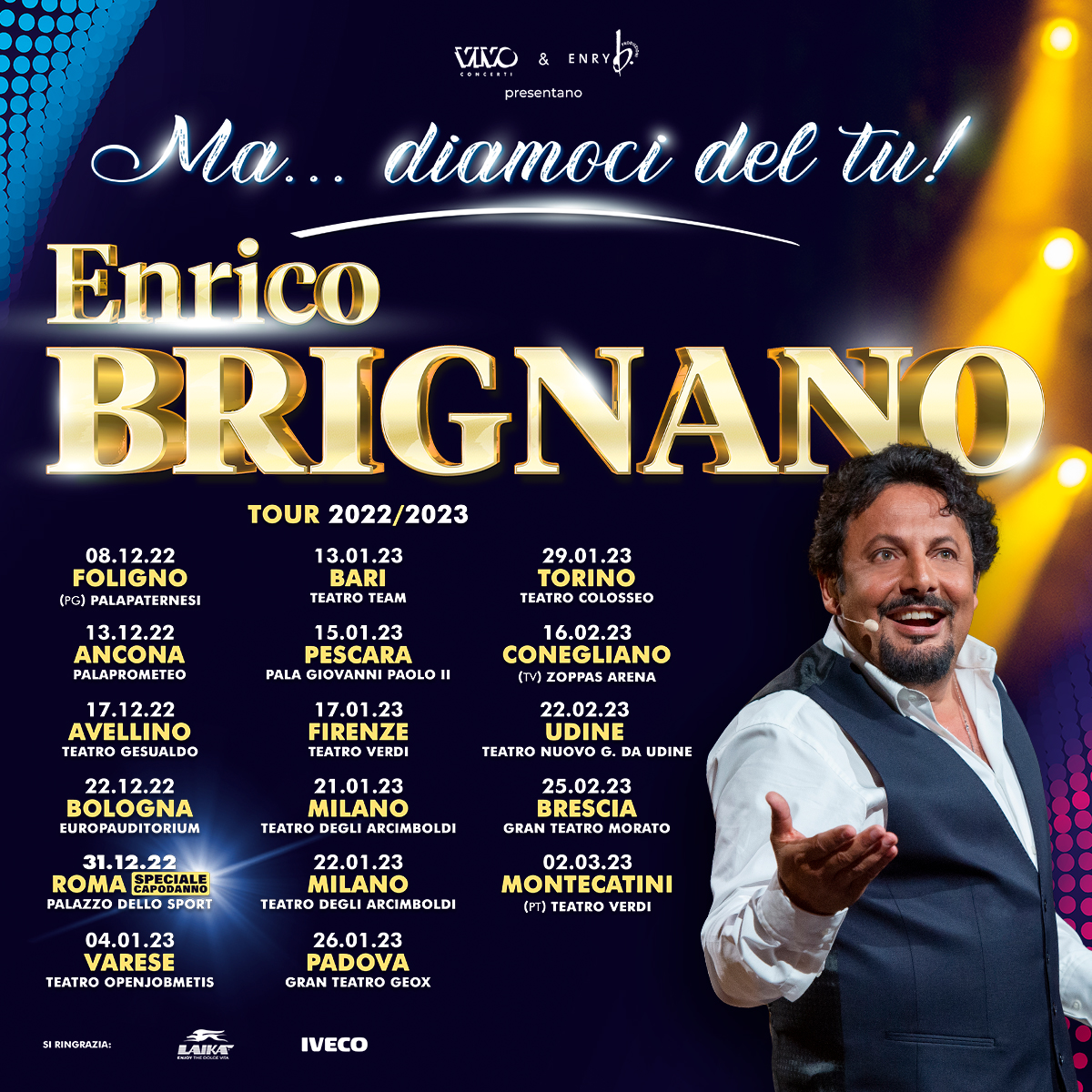 Enrico Brignano ha messo dunque in vendita i biglietti per il tour, che partirà da Foligno (giovedì 8 dicembre 2022 - Palapaternesi) e continuerà con Ancona (martedì 13 dicembre 2022 - Pala Prometeo), Avellino (sabato 17 dicembre - Teatro Gesualdo), Bologna (giovedì 22 dicembre 2022 - Europauditorium), la già annunciata data di Roma (sabato 31 dicembre 2022 - Palazzo dello sport), Varese (mercoledì 4 gennaio 2023 - Teatro Openjob Metis), Bari (venerdì 13 gennaio 2023 - Teatro Team), Pescara (domenica 15 gennaio 2023 - Pala Giovanni Paolo II), Firenze (martedì 17 gennaio 2023 - Teatro Verdi), Milano (sabato 21 gennaio 2023 e domenica 22 gennaio 2023 - Teatro Arcimboldi), Padova (giovedì 26 gennaio 2023 - Gran Teatro Geox), Torino (domenica 29 gennaio 2023 - Teatro Colosseo), Conegliano (giovedì 16 febbraio 2023 - Zoppas Arena), Udine (mercoledì 22 febbraio 2023 - Teatro Nuovo Giovanni da Udine), Brescia (sabato 25 febbraio 2023 - Gran Teatro Morato) per concludere con Montecatini (giovedì 2 marzo 2023 - Teatro Verdi).