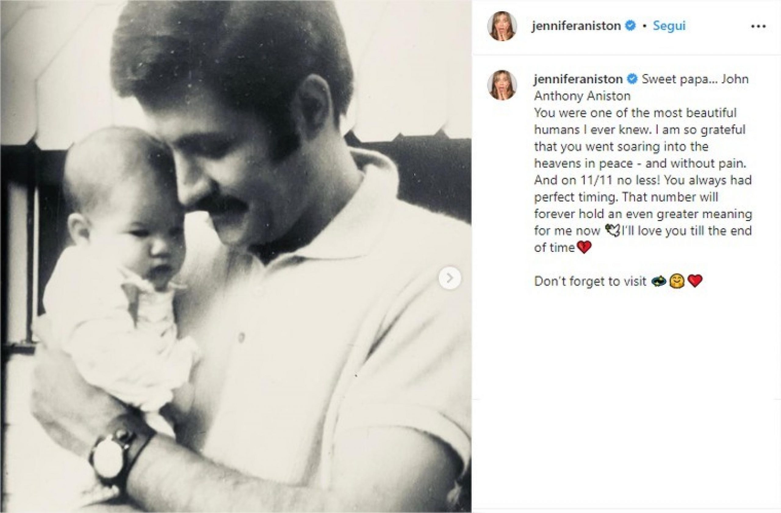 Jennifer Aniston ha salutato così suo padre, insieme ad una serie di foto postate in carosello per abbracciarne la memoria. Pubblicamente ha detto addio a John Aniston, anche lui pluripremiato attore star dello show soap opera americana Days of Our Lives, nel ruolo di Victor Kiriakis.