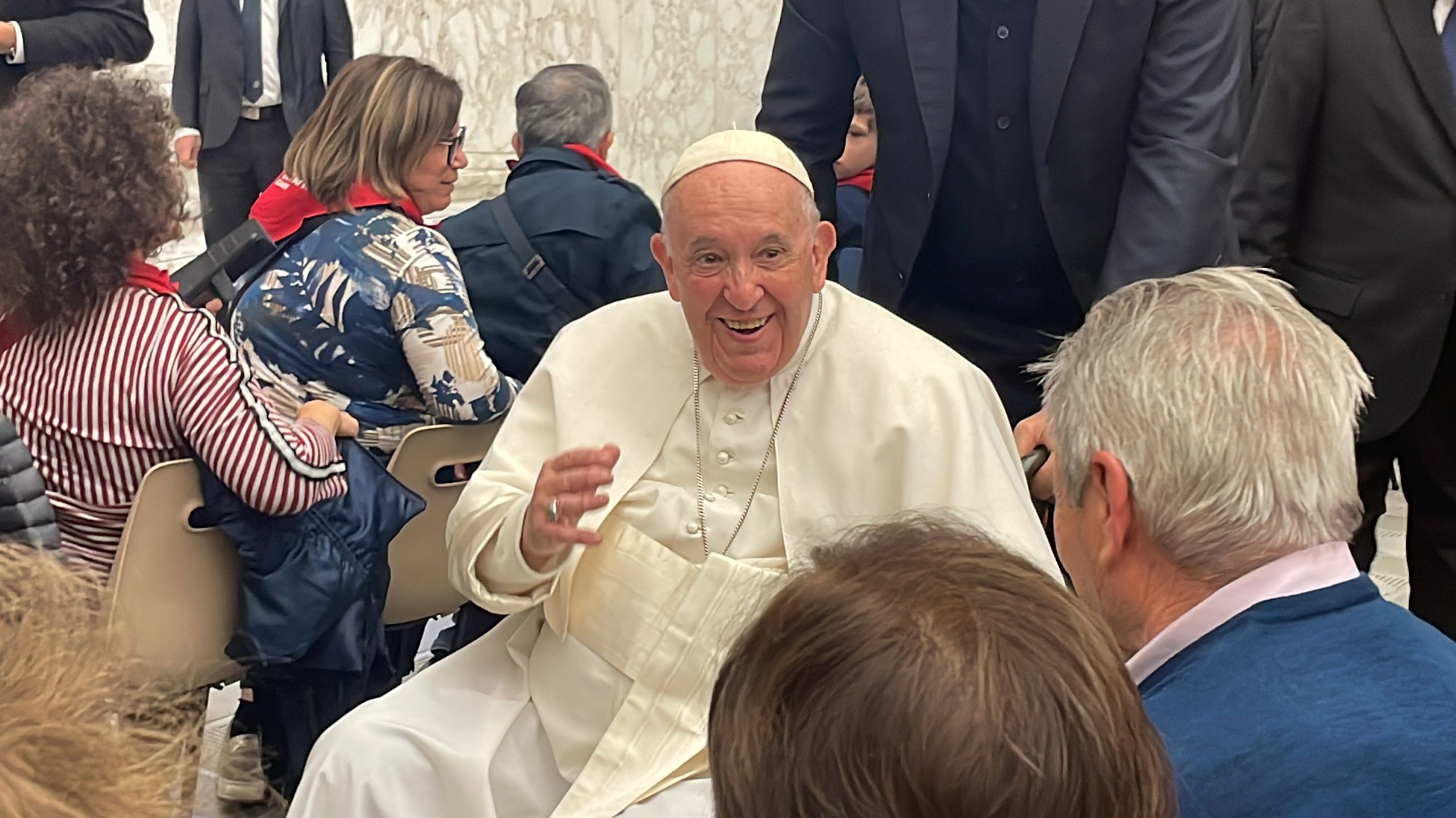 Papa Francesco è sceso con la sua carrozzina che da qualche tempo lo accompagna per i problemi al ginocchio per abbracciare fisicamente i disabili in prima fila regalando loro un momento di gioia.