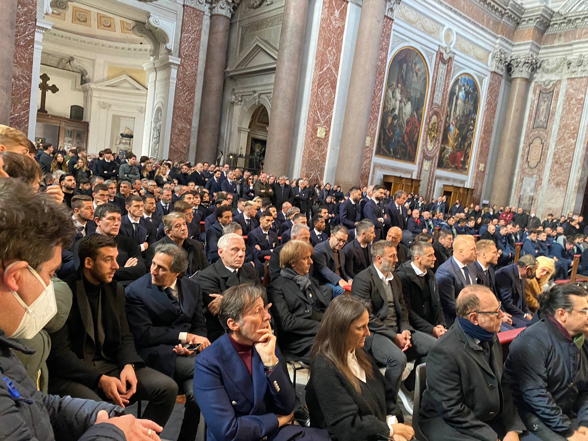 Alla fine della funzione funebre un lungo applauso dei presenti nella basilica saluta la bara di Mihajlovic. Roberto Mancini porta in spalla la cassa.