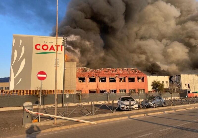 Il devastante incendio sta divorando gran parte della struttura del salumificio Coati e, al contempo, ha generato una densa colonna di fumo nero che si sta diffondendo nell’aria.
