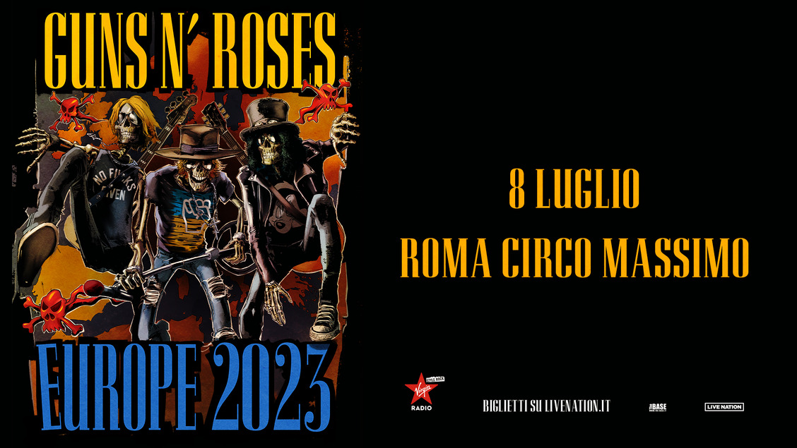 I Guns N' Roses tour 2023 Italia annunciano oggi l’unica imperdibile data italiana del tour mondiale l’8 luglio 2023 al Circo Massimo di Roma, nell'arena che ha reso grandi i gladiatori nella storia e che tra gli altri vedrà anche esibirsi proprio nella prossima estate "The Boss" Bruce Springsteen. Un evento unico per il ritorno della band americana in Italia, con i biglietti che saranno in vendita da domani. I membri del fan club potranno accedere alla Nightrain Presale della band a partire dalle ore 10:00 di mercoledì 22 febbraio. I biglietti saranno disponibili in anteprima per gli utenti My Live Nation dalle ore 10:00 di giovedì 23 febbraio. Per accedere alla presale basterà registrarsi gratuitamente su www.livenation.it. La vendita generale dei biglietti si aprirà a partire da venerdì 24 febbraio alle ore 10:00 su www.ticketmaster.it, www.ticketone.it e www.vivaticket.com.