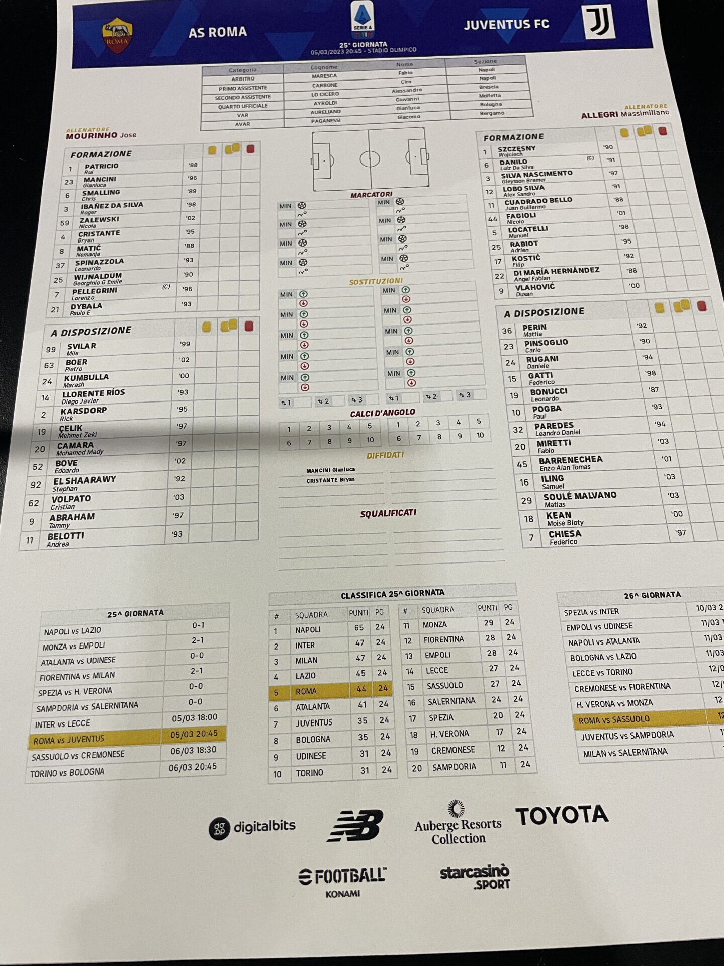 L'ufficio stampa dell'As Roma ci ha consegnato la distinta ufficiale del match con una formazione ricca di sorprese: José Mourinho sceglie di giocare senza un centravanti di ruolo mettendo Dybala come falso nove alla Totti. Alle sue spalle agiranno il capitano Lorenzo Pellegrini, reduce da una sindrome influenzale e Georgino Wijnaldum. Sorprese anche in casa Juventus con Pogba e Chiesa che partiranno dalla panchina.