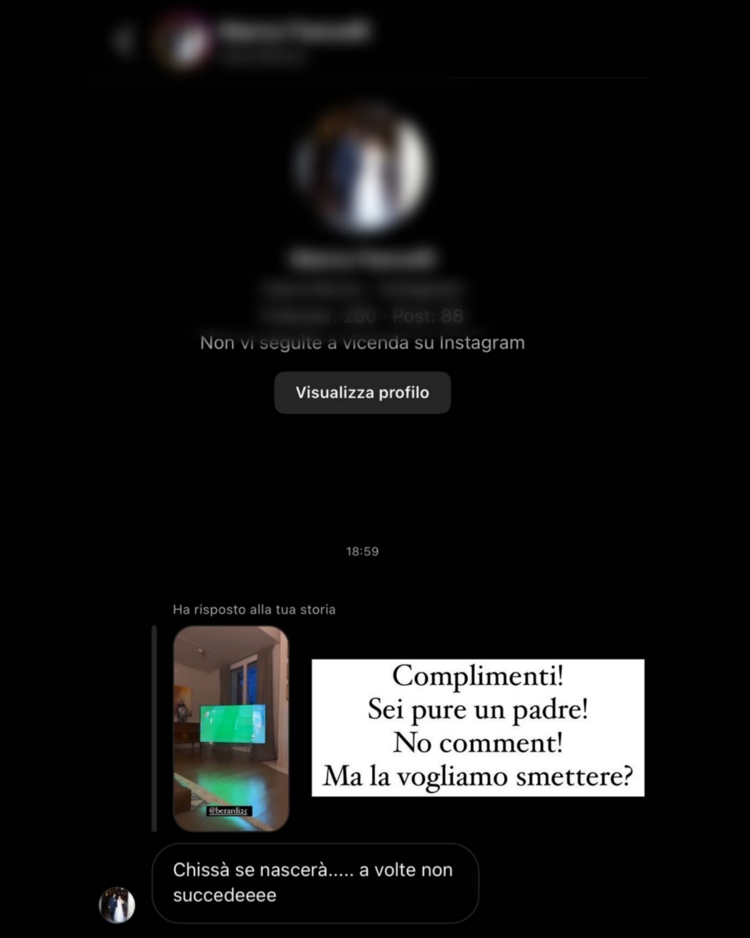 Denuncia social per Francesca Fantuzzi, moglie di Domenico Berardi. Era in corso la sfida fra Roma e Sassuolo quando la moglie del capitano neroverde pubblica una storia su Instagram dove mostra un messaggio ricevuto da un tifoso giallorosso che scrive chissà se nascerà, a volte non succede alla ragazza che replica con un Complimenti! Sei pure un padre! No comment! Ma la vogliamo smettere?. Non è la prima volta che la compagna dell’attaccante denuncia sui social coloro che la insultano mettendo in mostra il nome dell’autore.