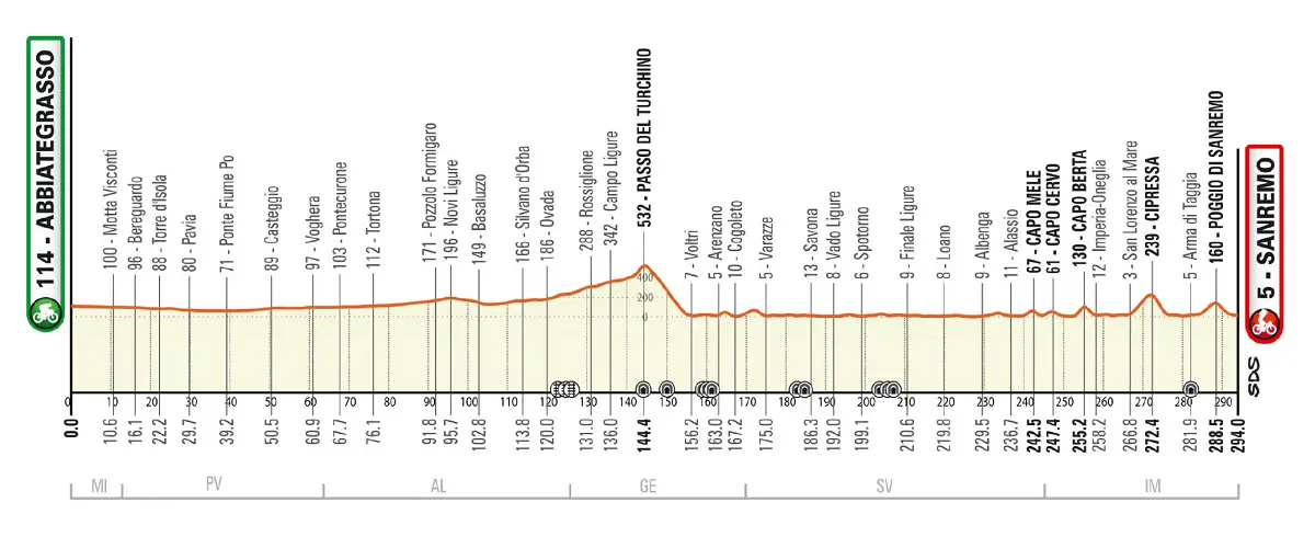 Come detto, il percorso della Milano-Sanremo 2023 vede lo spostamento dallo start fuori Milano, ossia ad Abbiategrasso. Quindi, il passaggio dei corridori è previsto nelle cittadine di Pavia e Ovada, quindi il passo del Turchino e via verso la parte finale della tappa con Capi Mele, Cervo e Berta, per poi affrontare la Cipressa (5.6 km al 4.1%) e il Poggio (3.7 km con pendenza media di quasi il 4% e punte dell’8%). Sarà in queste due ultime asperità che si deciderà la corsa.