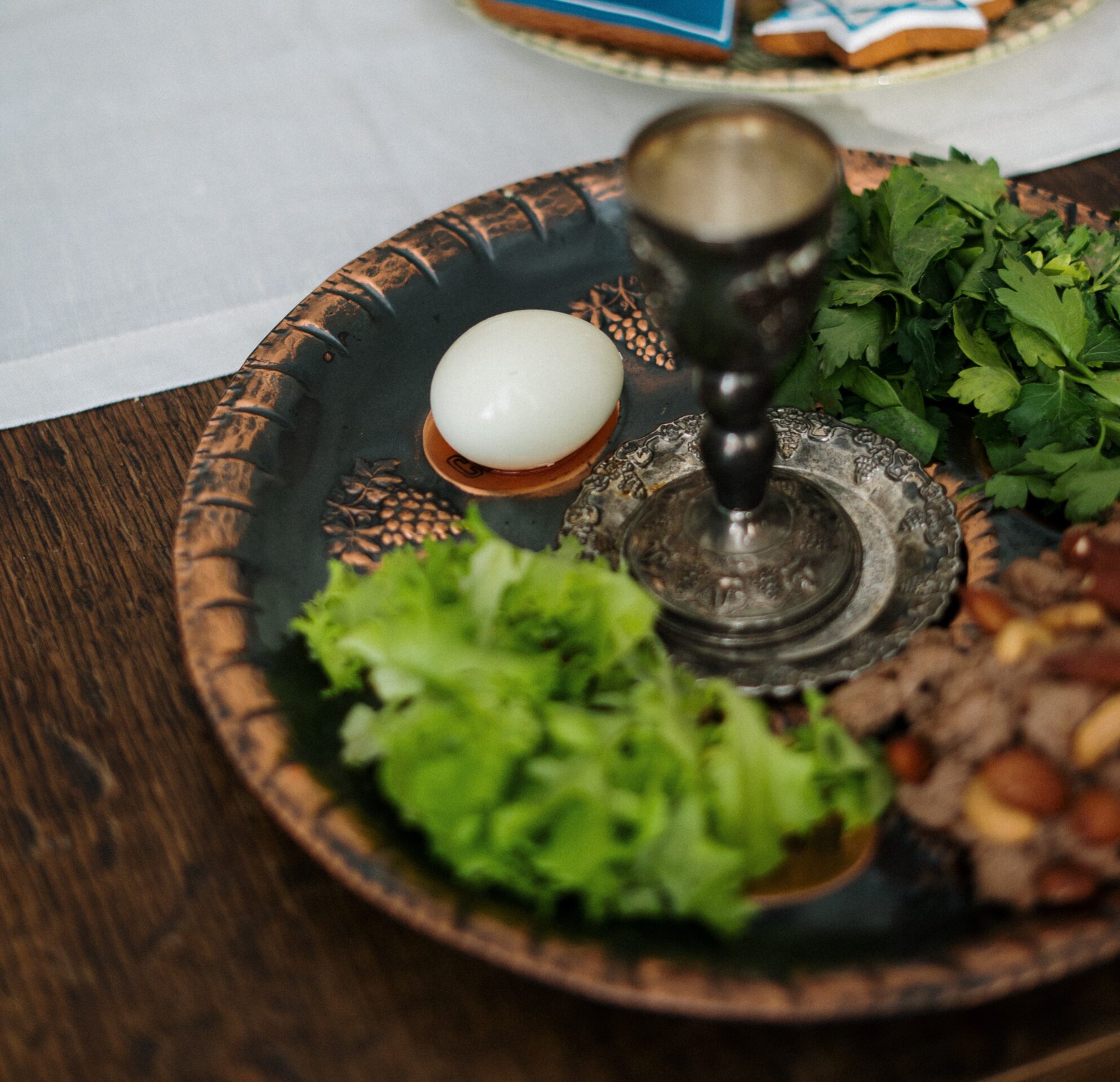 Durante il Seder è particolarmente importante il cosiddetto piatto del Seder, che contiene tutti i principali simboli della festa. Al centro è raffigurato il pane azzimo, a ricordare la precipitosa fuga dall'Egitto. Tutto attorno vi sono il karpas, un gambo di sedano che ricorda il periodo della mietitura, le erbe amare, che rappresentano la durezza della schiavitù, una zampa arrostita di capretto, a ricordare l'agnello che gli ebrei sacrificarono nella notte della morte dei primogeniti egiziani, un uovo sodo in relazione alla distruzione del Tempio e, infine, la Charoset, una sorta di marmellata che rappresenta la malta usata dagli ebrei durante la schiavitù per la costruzione delle città egiziane.
