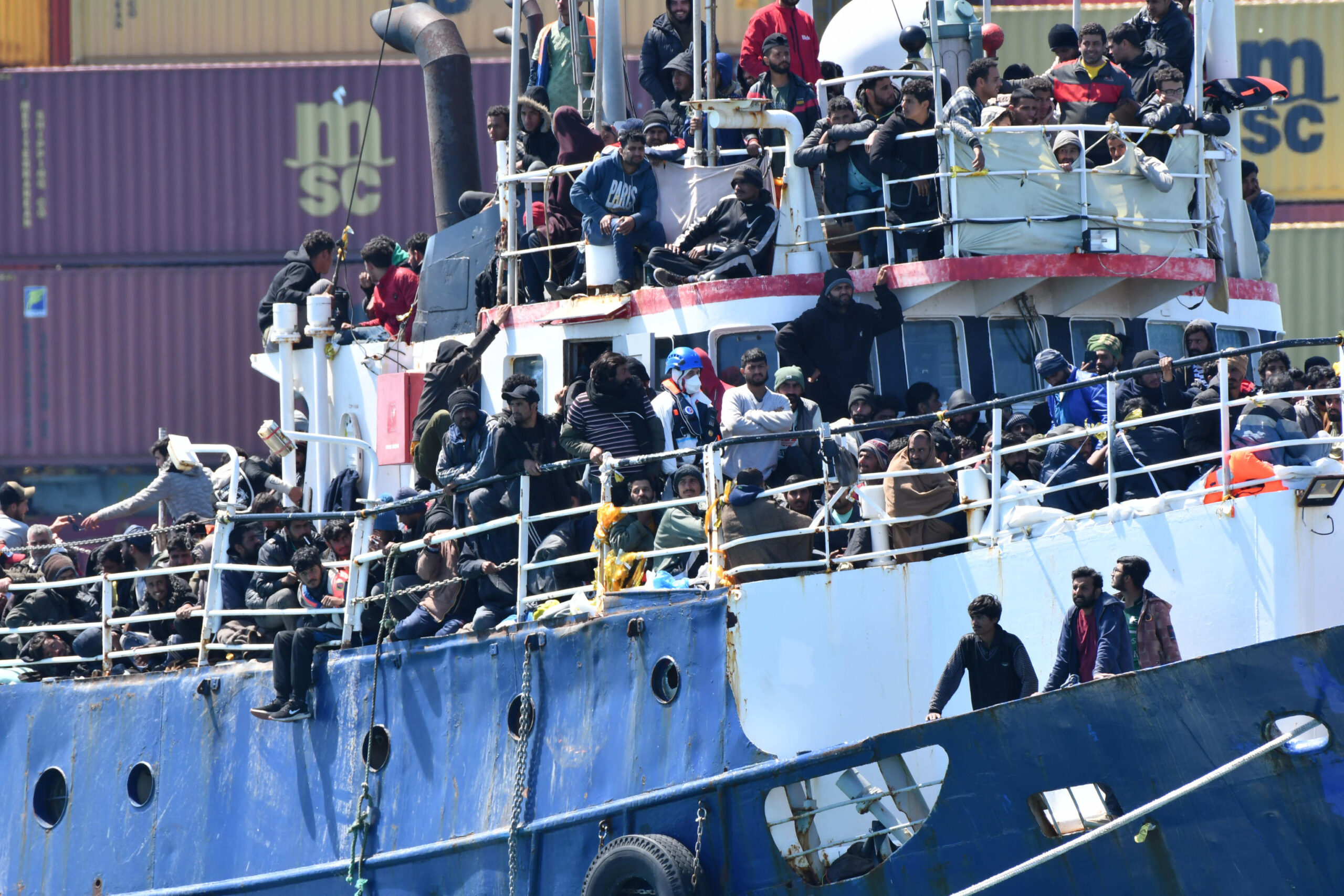 A Catania sono sbarcati i 700 migranti salvati a bordo di un peschereccio nei giorni scorsi in un intervento Sar a 100 miglia da Capo Passero. L'imbarcazione è trainata da un rimorchiatore e scortata dalla nave Peluso della Guardia costiera. I migranti quando arrivati al porto, al molo di Levante, e sono scesi dalla barca hanno esultato con le braccia aperte al grido: